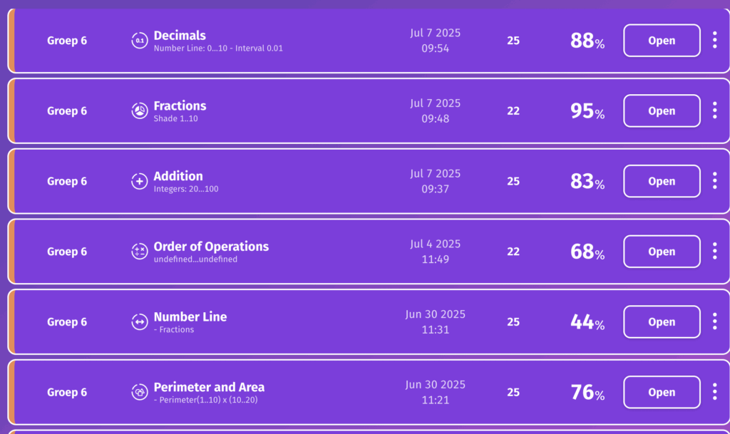 Bij rekenen werk ik regelmatig met 99math, waarmee leerlingen in real-time sommen maken op hun eigen chromebook, terwijl ik op het bord de voortgang kan volgen. Het competitieve element motiveert de leerlingen en verhoogt de focus tijdens het oefenen. Ook Kahoot zet ik in, bijvoorbeeld als korte evaluatie aan het einde van de les of als energizer tussendoor.